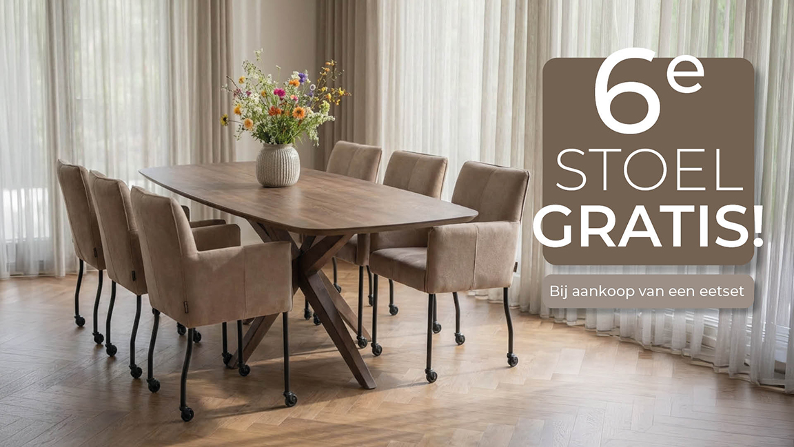 Bij aankoop van een complete BAENKS eetset, een eettafel met bijpassende stoelen, krijg je de 4e stoel voor de halve prijs óf de 6e stoel gratis.