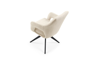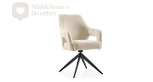 De Rosebery armstoel met open armleuning oogt licht en speels door het sierlijke detail in de arm. Bekleed in de stof Perfect Harmony in ivoorwit geeft hij het interieur een frisse en uitnodigende uitstraling. Voorzien van een zwarte metalen poot met terugdraaifunctie voor extra gemak. Ideaal voor moderne en Scandinavische woonstijlen. Afmetingen: H87 × B58 × D64 cm.