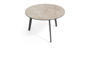 Een strakke salontafel, welke gekenmerkt wordt door een rond blad op een luchtig metalen frame. Het keramieken blad in de prachtige kleur cement grijs en de metalen poten zijn zwart gelakt. Zoals getoond: salontafel met zwarte metalen poten en blad in keramiek cement grijs. Afmetingen: H33 x ø70 cm.