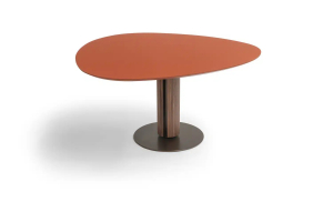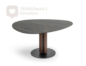 De volledig asymmetrische design eetkamertafel Steely is met haar afmetingen van 145 bij 129 cm (blad) klein van stuk, maar biedt met gemak ruimte aan vijf eters, dankzij de aparte vorm. Voor wie efficiënt om wil gaan met de ruimte in zijn of haar eethoek is de Steely een echte aanrader!