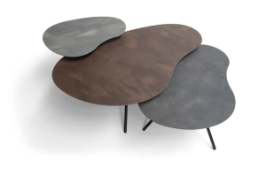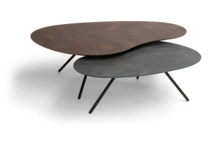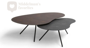 De tafelbladen van Cloudy's zijn leverbaar in diverse materialen, welke ook met elkaar gecombineerd kunnen worden. Wat dacht u bijvoorbeeld van de combinatie notenfineer met zwart FenixNTM of HPL Plastica brons met HPL porfido nero? De slanke pootjes van de Cloudy's zijn uitvoerbaar in RVS of zwart epoxy. Heeft u aan één salontafel genoeg? De Cloudy's zijn ook gewoon als losse salontafel verkrijgbaar.
